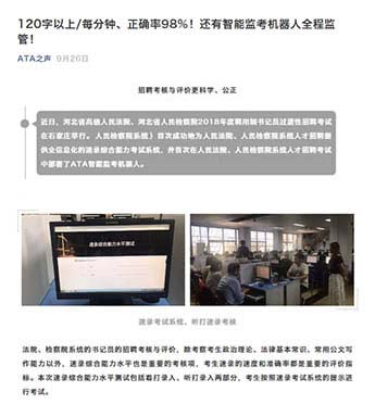監考機器人已成功服務了多次大規模考試,服務對象包括“全國稅務師職業資格考試”,“全國專利代理人資格考試”,“銀行專業人員職業資格考試”,“人民檢察院系統人才招聘考試”,以及“ACT(香港考點)”等等,廣受好評。